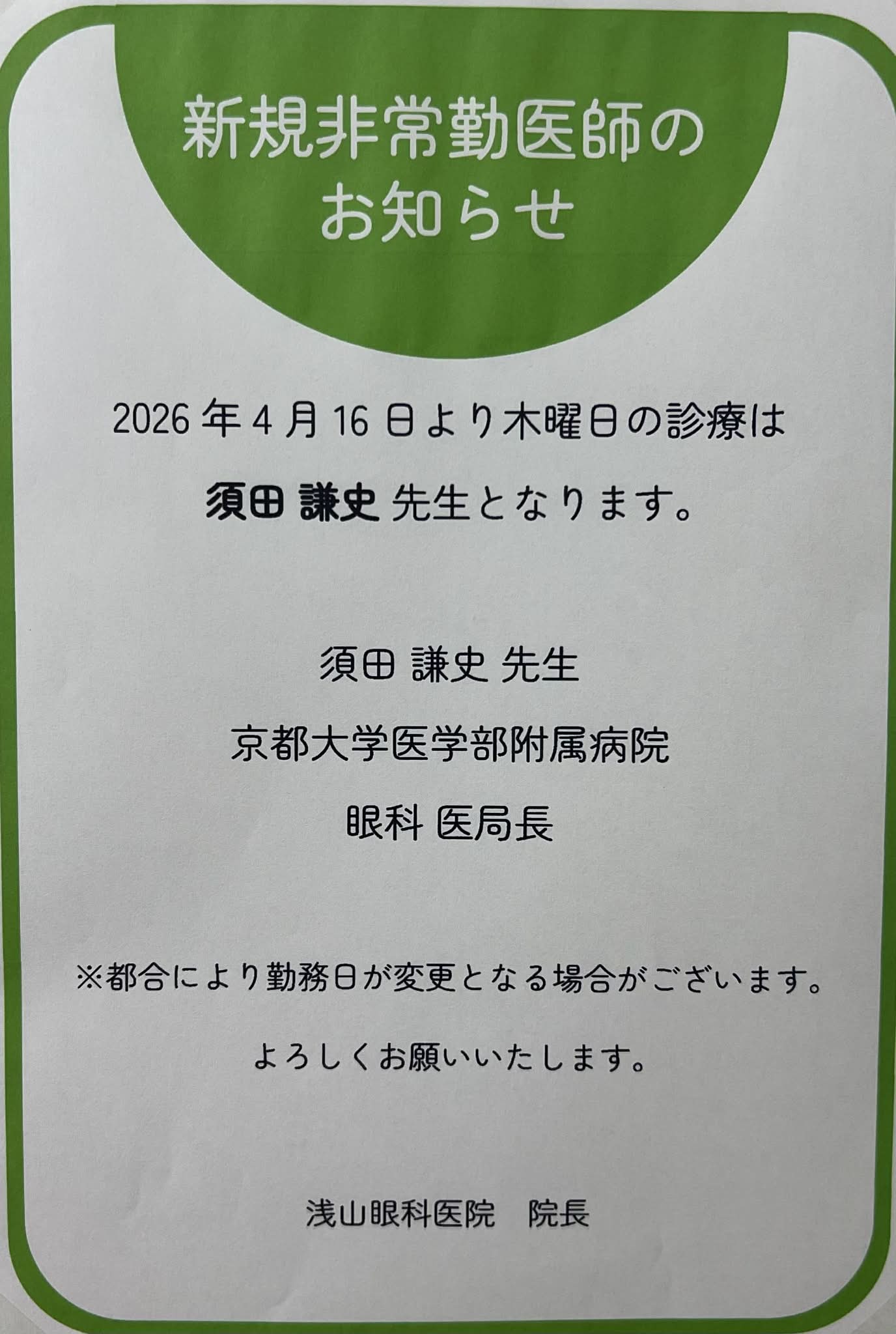 新規非常勤医師のお知らせ(2026/4/7更新)2026年4月16日(木)より、木曜日の診療は 「須田 謙史先生」となります。 須田 謙史先生 京都大学医学部附属病院 眼科医局長 ※都合により勤務日が変更となる場合がございます。 ![]() |